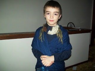 Here is a picture from a recent homeschool project. This is #2 sporting his workmanship. (the "thing" on his neck)